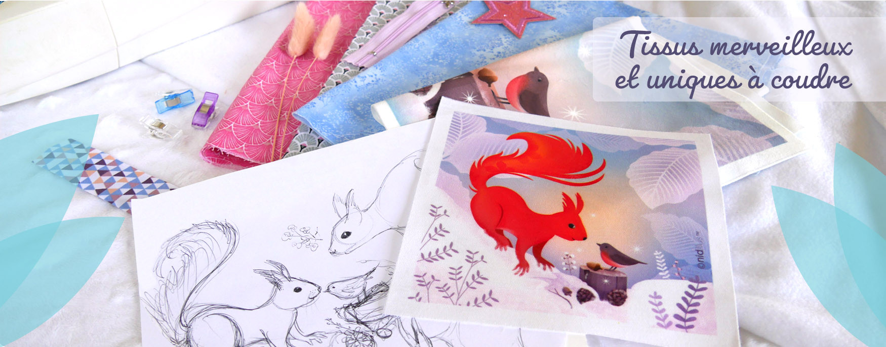Bienvenue dans mon univers merveilleux. Je suis illustratrice jeunesse et graphiste. C'est à Clisson, en Loire-Atlantique, entourée de châteaux, de ruines et de forêts verdoyantes que mon imagination ne cesse de créer de nouveaux modèles poétiques et oniriques pour rendre vos confections 100 % uniques. Chacun de mes petits « tableaux d’artiste » imprimés sur tissu, s’insère dans vos créations textiles avec des mélanges de rubans, passepoils, broderies et autres tissus pour une couture très créative. Ajoutez de l’originalité et de la poésie à vos accessoires et faites rêver petits et grands au quotidien.
