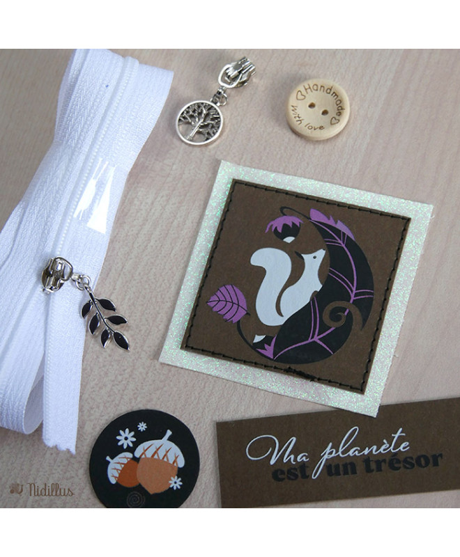 Assortiment Couture créative Etiquettes + zip - Thème: Secret d'Ecureuil - Fond marron