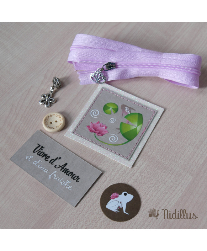 Assortiment Couture créative Etiquettes + zip rose - Thème: Nénuphar