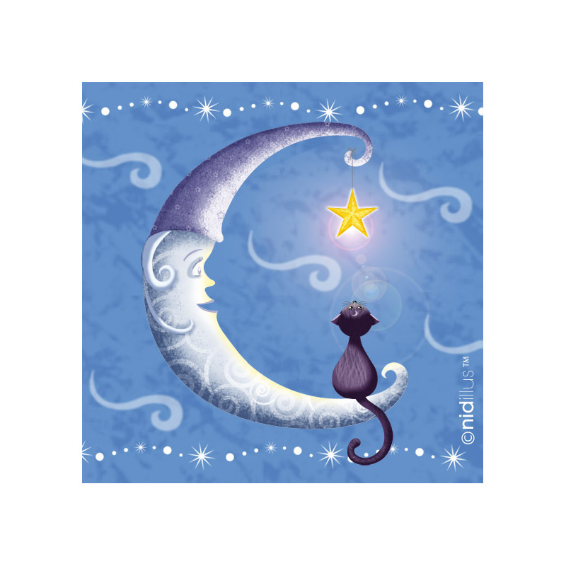 Laissez-vous bercer par la poésie nocturne avec ce tissu illustré d'un chat perché sur un croissant de lune sous un ciel étoilé.