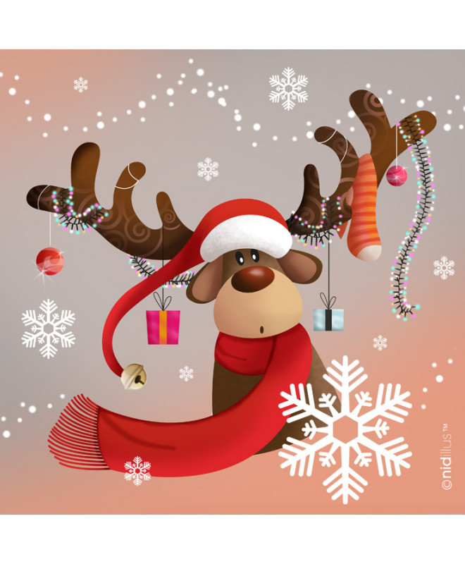 Succombez au charme festif avec ce tissu illustré par l'artiste avec un adorable renne paré de guirlandes scintillantes, boules colorées et petits cadeaux suspendus à ses bois !