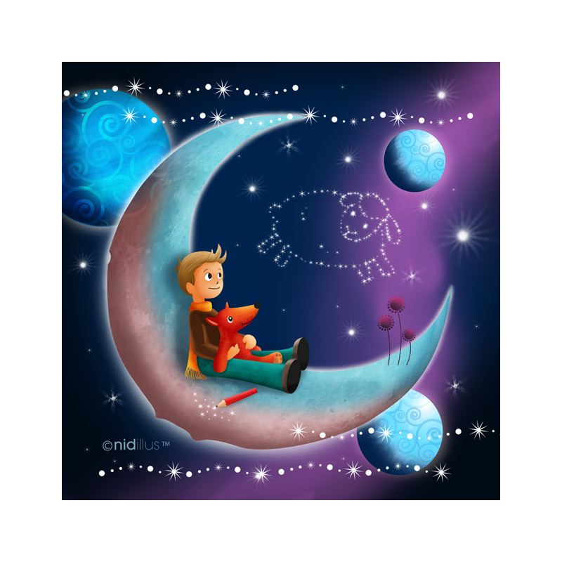 Coupon de tissu illustré avec un enfant dans les étoiles et la magie du dessin.